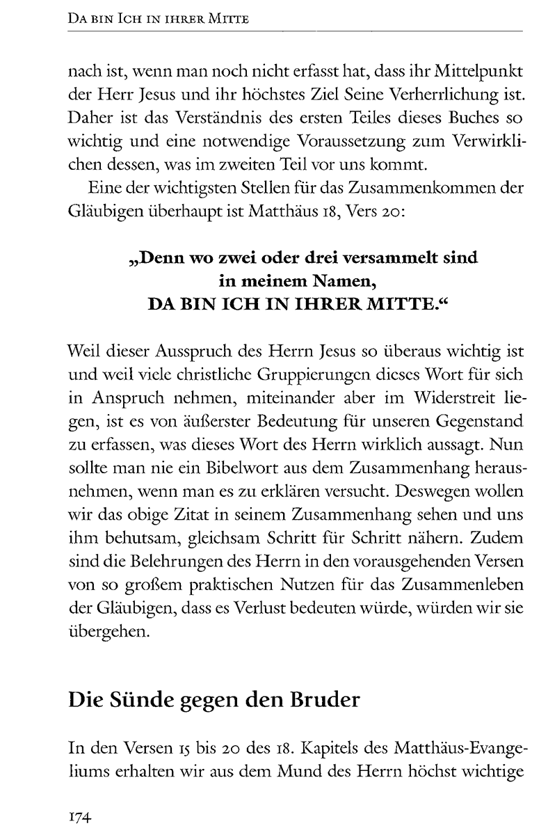 Des Weiteren geht der Autor auf die praktischen Belehrungen des Neuen Testaments über das Zusammenkommen der Gläubigen ein. Dabei stehen die Themen «Versammelt zu seinem Namen hin», «Mahl des Herrn und Tisch des Herrn», «Gaben und Ämter», «Der christliche Dienst» und «Die Einheit des Geistes» im Vordergrund.