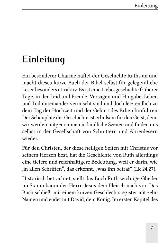 Dieser Kommentar über das Buch Ruth zeigt anhand der verschiedenen Personen auf, dass sich der Mensch sowohl auf einem falschen als auch auf einem richtigen Weg befinden kann. Über allem aber steht die Gnade in ihrer wiederherstellenden Kraft und das Ziel Gottes: Die Ruhe für die Seele.