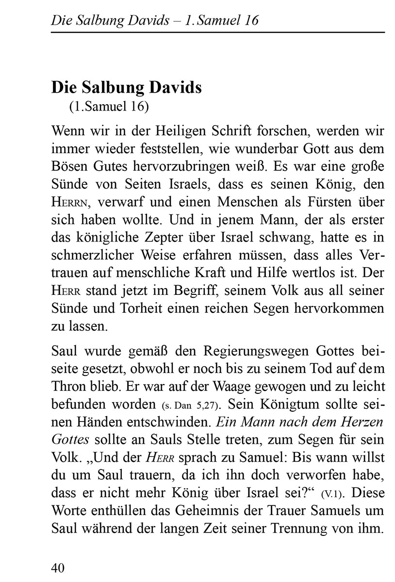 So will Gott uns durch Davids Lebensbericht anspornen, im Vertrauen auf Ihn Mut zu fassen und selbst ein Glaubensleben in der engen Gemeinschaft mit dem Herrn Jesus zu führen. Gott will unsere einzige Zuflucht und unser fester Halt sein – so wie Er es für seinen Knecht David gewesen ist.