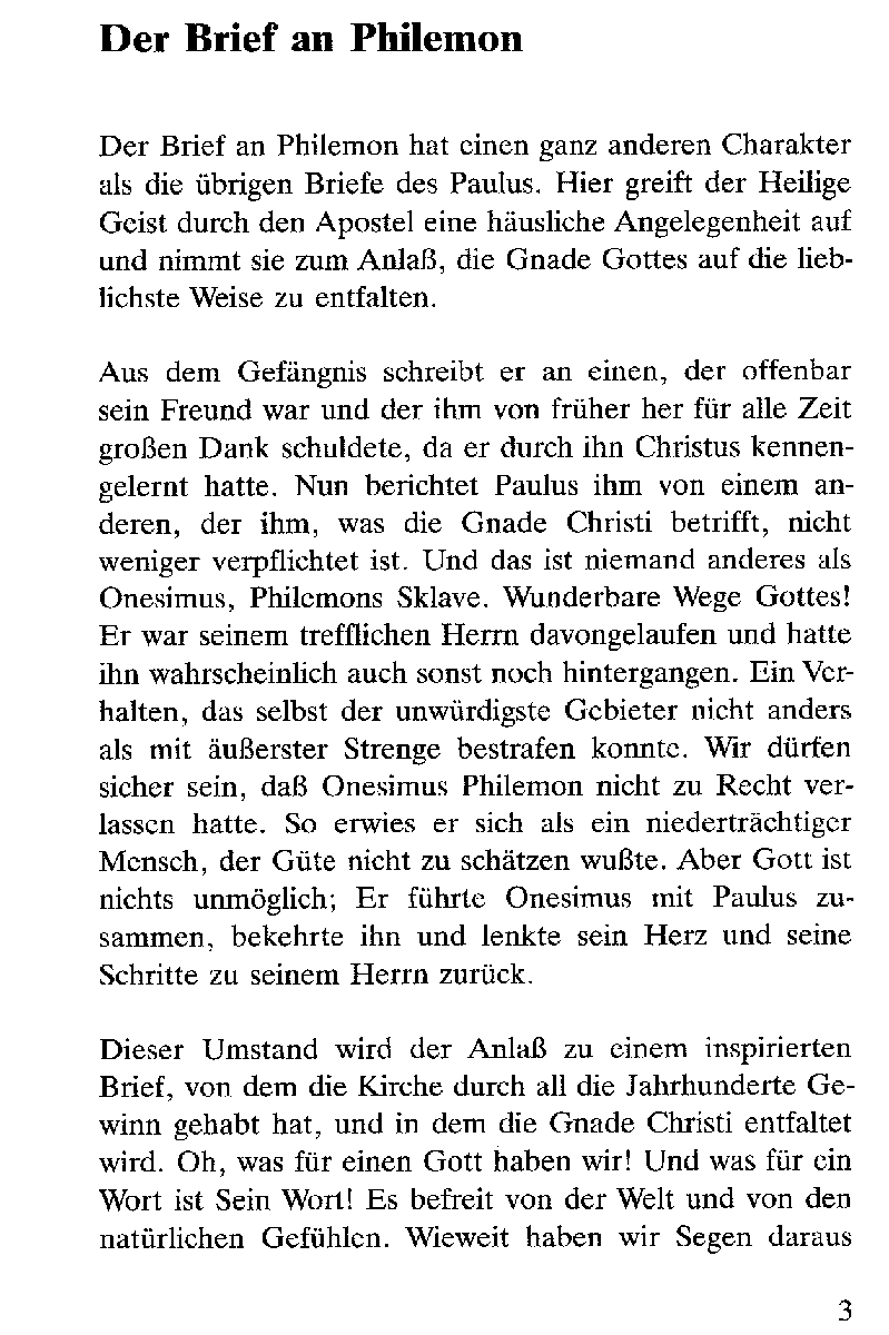 Der Brief an Philemon hat einen ganz anderen Charakter als die übrigen Briefe des Paulus. Hier greift der Heilige Geist durch denselben Apostel eine häusliche Angelegenheit auf und nimmt sie zum Anlass, die Gnade Gottes auf die schönste Weise zu entfalten.