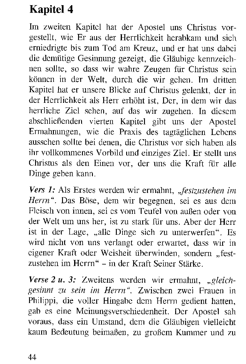 Im Philipper-Brief finden wir kaum Lehre oder zumindest keine formale Entfaltung von Lehre. Wir finden dagegen eine schöne Darstellung wahrer christlicher Erfahrung. Die Gläubigen werden hier nicht als gemeinsam in Christus Jesus in die himmlischen Örter versetzt gesehen, wie im Epheser-Brief, sondern auf ihrem Weg durch diese Welt, wobei sie das vergessen, was dahinten liegt, und vorwärts eilen, hin zu Christus Jesus in der Herrlichkeit.