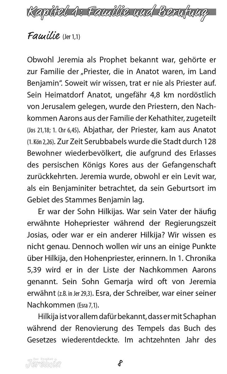 Das vorliegende Buch vereint geschickt die verschiedenen Gesichtspunkte von Jeremias Leben und Dienst. Die kurzen, prägnanten Kapitel machen es leicht, sie zu überblicken und auf unser Leben anzuwenden. Die Fragen am Ende jedes Kapitels sind auch hilfreich, wenn man sich gemeinsam mit dem Propheten Jeremia beschäftigen möchte.