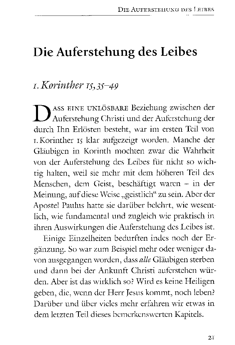 Der Tod ist für den Gläubigen ein besiegter Feind. Gott wird allen, die an Seinen Sohn Jesus Christus glauben, den Sieg über den Tod geben. Aber wie wird Gott das tun? Mit was für einem Körper wird Er die Gläubigen ausrüsten für den Himmel? Antworten auf solche Fragen gibt das fünzehnte Kapitel des ersten Korintherbriefes.
