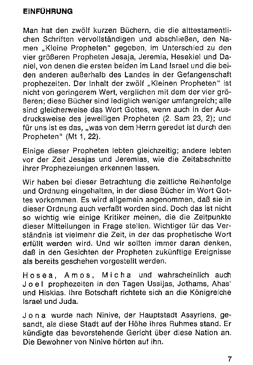Man hat den zwölf kurzen Büchern, die die alttestamentlichen Schriften vervollständigen und abschliessen, den Namen «Kleine Propheten» gegeben, im Unterschied zu den vier grösseren Propheten Jesaja, Jeremia, Hesekiel und Daniel, von denen die ersten beiden im Land Israel und die beiden anderen ausserhalb des Landes in der Gefangenschaft prophezeiten. Der Inhalt der zwölf «Kleinen Propheten» Hosea, Joel, Amos, Obadja, Jona, Micha, Nahum, Habakuk, Zephanja, Haggai, Sacharja und Maleachi ist nicht von geringerem Wert, verglichen mit dem der vier grösseren; diese Bücher sind lediglich weniger umfangreich; alle sind gleicherweise das Wort Gottes, wenn auch in der Ausdrucksweise des jeweiligen Propheten (2. Samuel 23,2); und für uns ist es das «was von dem Herrn geredet ist durch den Propheten» (Matthäus 1,22).