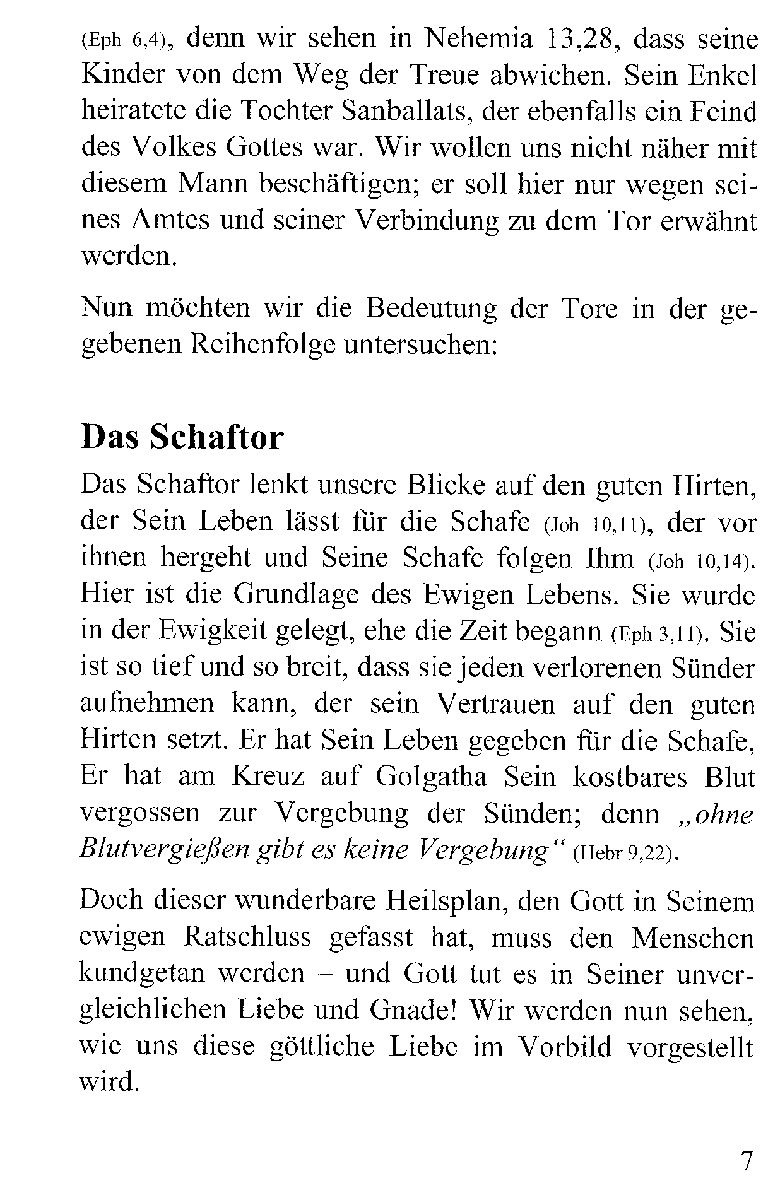 Diese kleine Arbeit behandelt die zehn Tore in der Mauer Jerusalems, wie sie in Nehemia 3 aufgezählt werden. Die Bedeutung der Namen in ihrer Reihenfolge gibt uns ein Bild von dem gesunden Fortschritt im geistlichen Leben des Gläubigen.