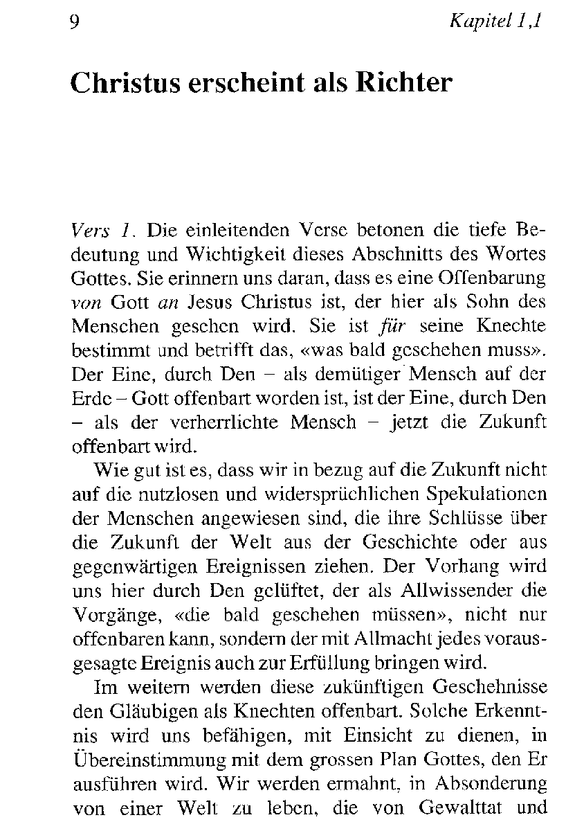 Im Gegensatz zu den alttestamentlichen Prophezeiungen entfaltet uns die Offenbarung nicht nur den kommenden Ablauf der Ereignisse auf dieser Erde, sondern sie lüftet auch den Schleier, damit wir in die Ewigkeit hineinschauen und die Segnungen kennen lernen können, die die Erlösten im ewigen Zustand erwarten. Diese wunderbare und gründliche Entfaltung der Zukunft sollte einen moralischen Einfluss auf unser Leben ausüben.