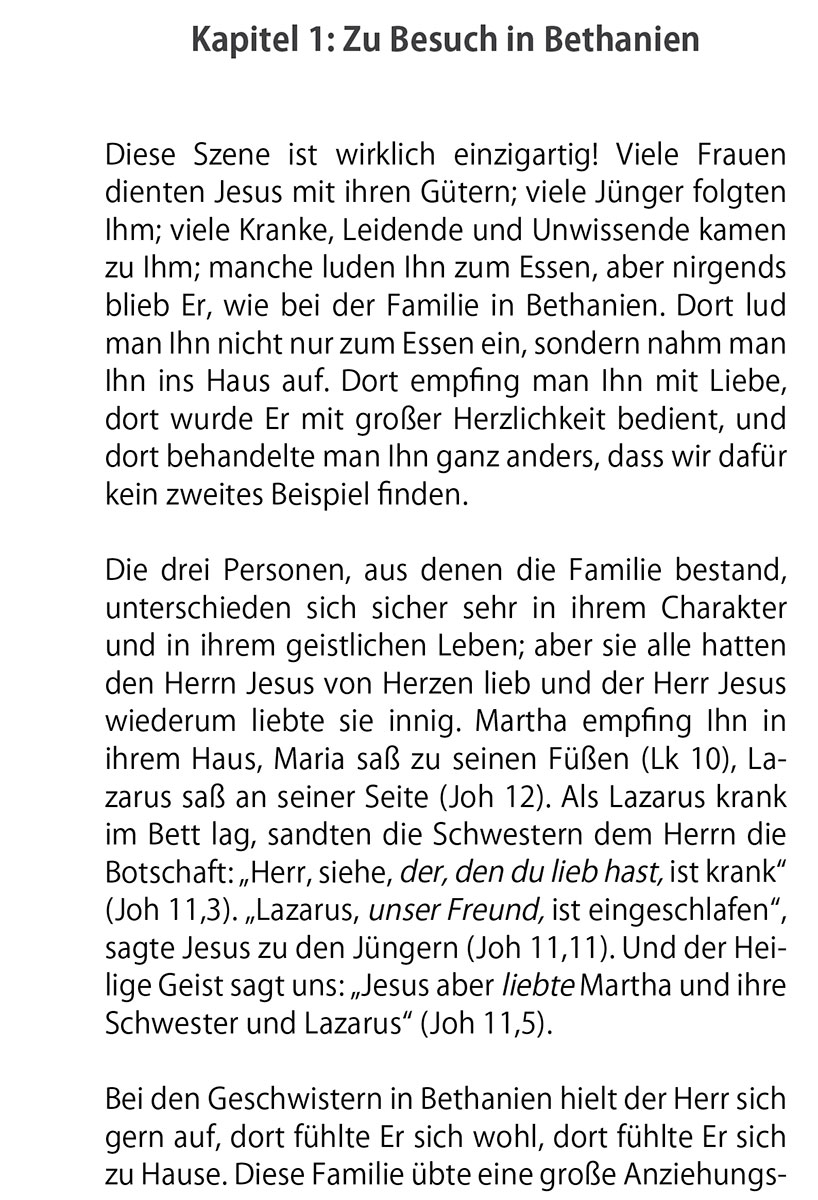 Klar und einfühlsam lässt Voorhoeve die Charaktereigenschaften von Martha, Maria und Lazarus zum Herzen der Leser sprechen. Mittelpunkt seiner Erläuterungen ist dabei der Herr Jesus Christus. Um Ihn drehte sich auch damals alles im Haus in Bethanien.