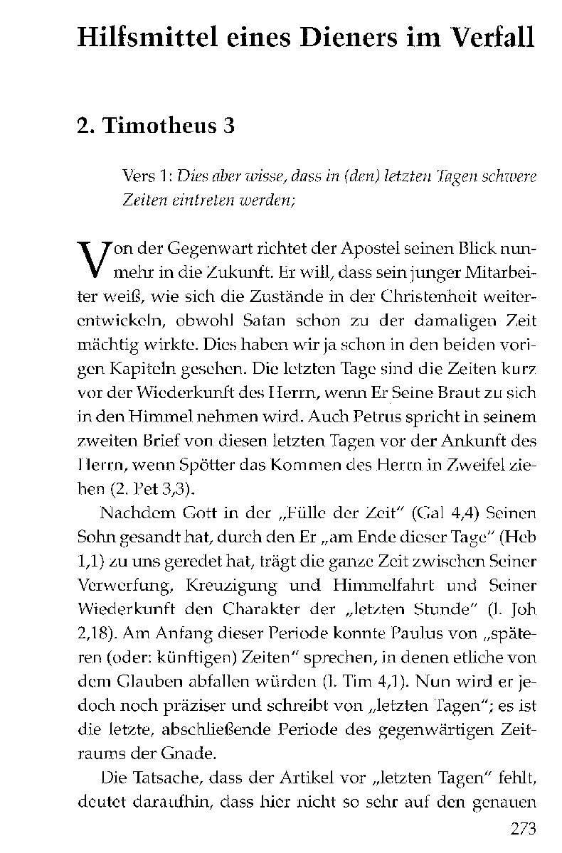 «Schwere Zeiten» – so lautet die ausführliche Diagnose, die der Apostel dem Timotheus und damit auch uns im zweiten Brief mitteilt. Aber der Christ, der als ein treuer Diener des Herrn Jesus leben möchte, ist den verschiedenen Strömungen dieser gefährlichen Zeit nicht schutzlos preisgegeben.