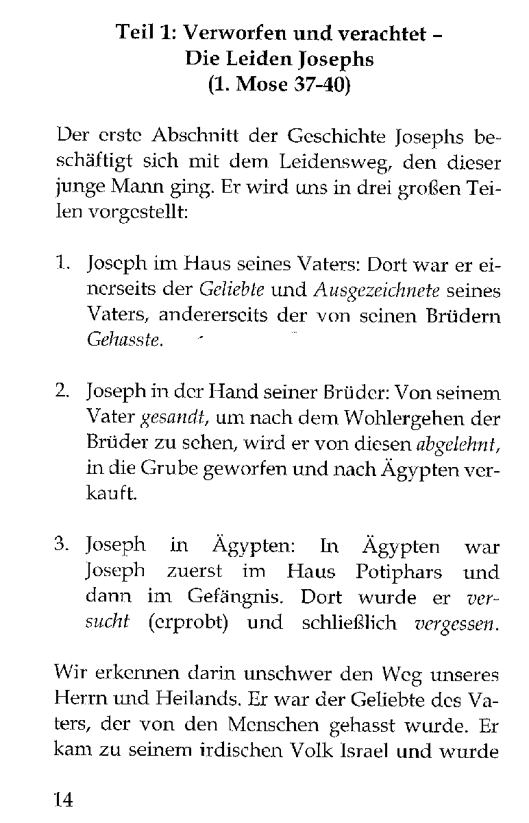 Joseph ist eine faszinierende Gestalt im Alten Testament. Seine Geschichte weist uns auf eine Person hin, dessen Lebensweg uns noch mehr bewegt: auf unseren Herrn und Heiland Jesus Christus. Jeder, der die Bibel liest, hat Freude daran, das Leben Josephs im Licht des Neuen Testaments zu betrachten. Die zahlreichen Parallelen zwischen Joseph und Jesus beeindrucken einfach immer wieder neu!