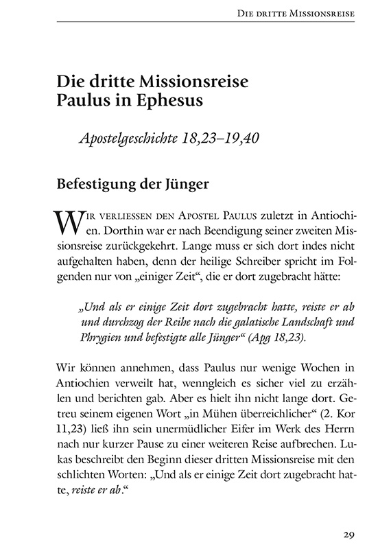 In den Kapiteln 18 bis 20 wird von der segensreichen Arbeit des Apostels Paulus in Korinth berichtet sowie von dem Beginn seiner dritten Missionsreise, bei der er viele Jünger befestigt und das Evangelium treu verkündigt hat. In Milet hielt Paulus schliesslich eine bemerkenswerte Ansprache vor den Ältesten aus Ephesus. Diese Abschiedsrede des Apostels ist bis heute von höchstem Interesse und bewegt das Herzen des gläubigen Lesers.