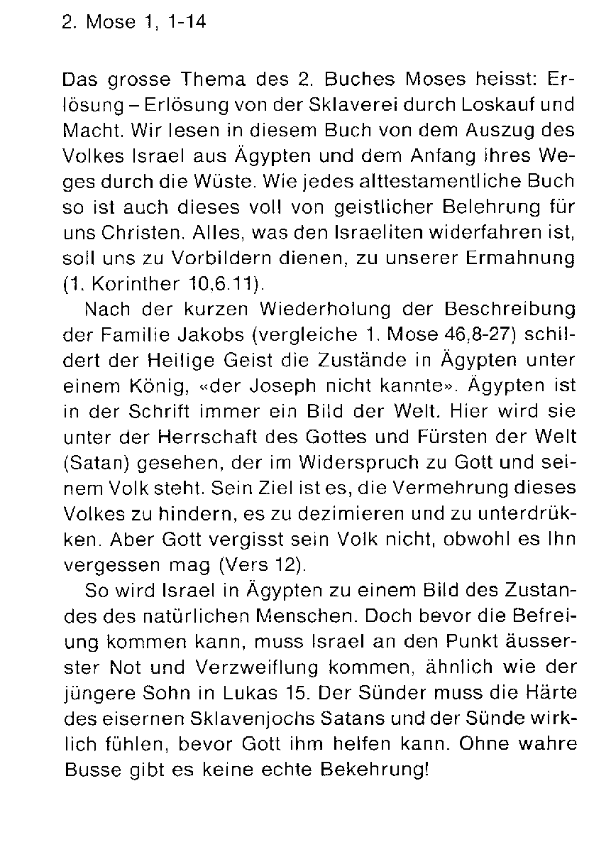 Eine Hilfe zum Studium des 2. Buches Mose, das die Berufung Israels als Volk Gottes beschreibt. Gott wollte in der Mitte dieses auserwählten Volkes wohnen und dessen Gott sein. Um sein Vorhaben zu verwirklichen, ordnete Er den Bau eines Heiligtums bis in alle Einzelheiten an. Er zeigt uns mit diesen «Schatten» den Mittelpunkt seines Ratschlusses und seine Wege mit den Menschen: Christus und seine Versammlung.