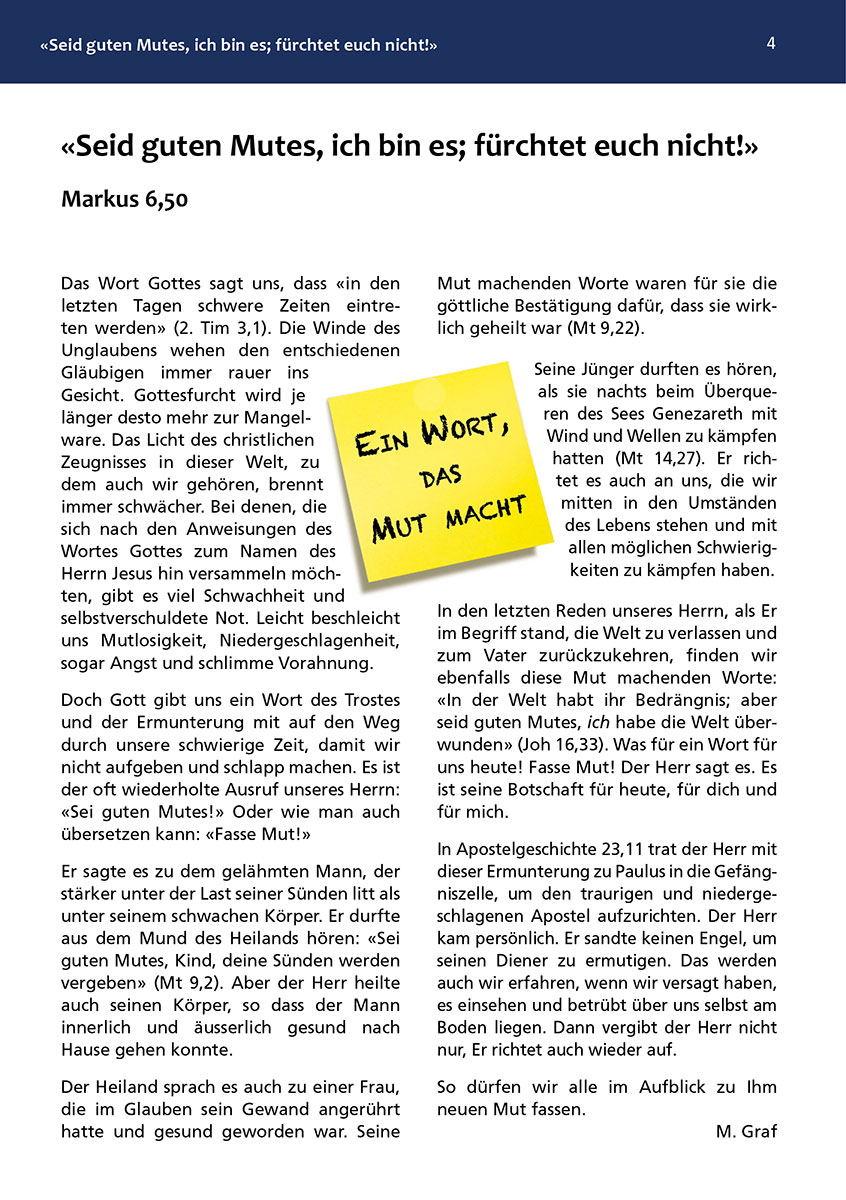 Diese zweimonatlich erscheinende Zeitschrift möchte uns Christen helfen, am Wort Gottes festzuhalten. Zweimal wird der gläubige Christ im Neuen Testament aufgerufen, festzuhalten: «Halte fest das Bild gesunder Worte» und «halte fest, was du hast.» Das Bild gesunder Worte umfasst die ganze Bibel. Deshalb behandeln die längeren und kürzeren Artikel alle darin vorkommenden Themen. Einige Beispiele sind: