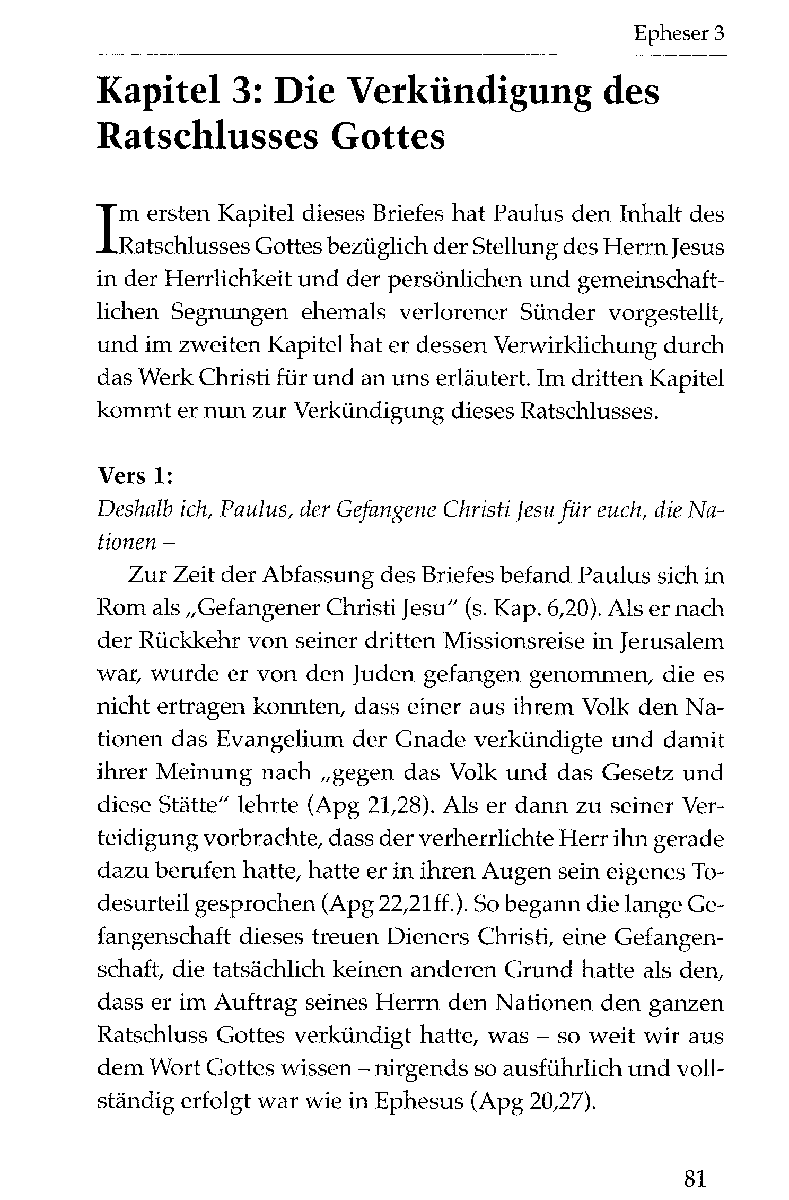Paulus teilt uns im Epheser-Brief Wahrheiten mit, die wir in keiner anderen Schrift des Neuen Testaments finden. Dieser Brief geht nicht davon aus, was der Mensch nötig hat, sondern von dem, was im Vaterherzen Gottes ist. Er lässt uns in Sphären blicken, die von der Erde weit entfernt sind: die «himmlischen Örter». Zu Anfang wird uns der ewige Heilsratschluss Gottes mitgeteilt, dann die Verwirklichung dieses Ratschlusses und die Offenbarung des Geheimnisses Gottes in Christus.