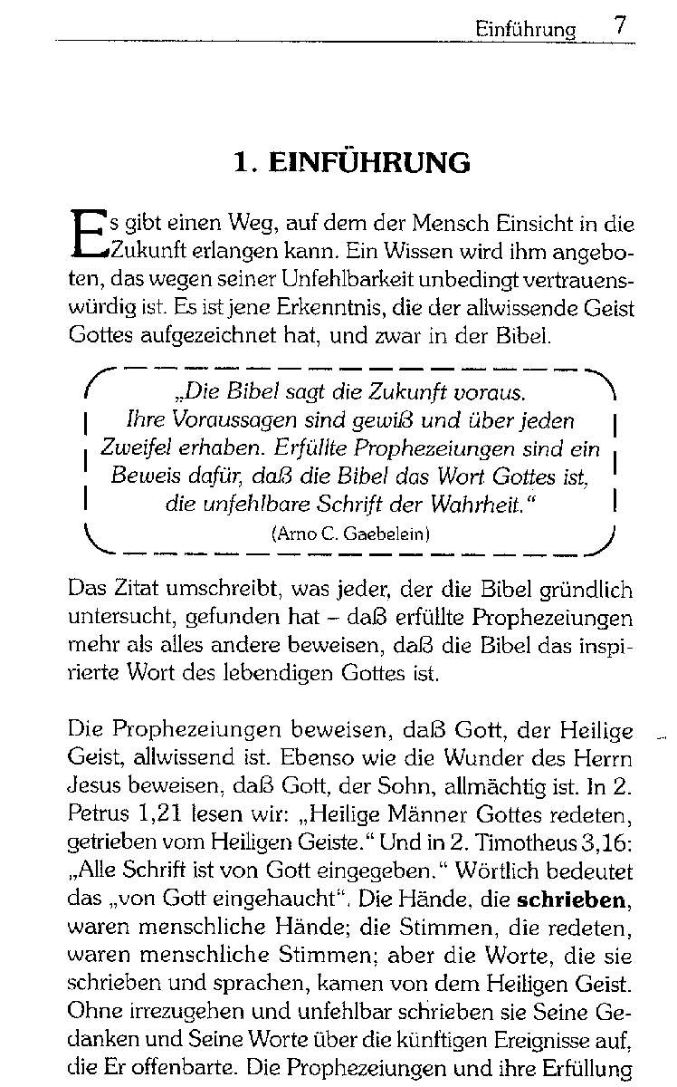 Dieses Buch ist als eine Kurzeinführung in die biblische Prophetie gedacht. Auf jeweils drei bis vier Seiten geht der Autor, der bereits durch eine Auslegung des Propheten Maleachi im deutschen Sprachraum bekannt ist, in zwölf Kapiteln gezielt auf verschiedene Themen ein.