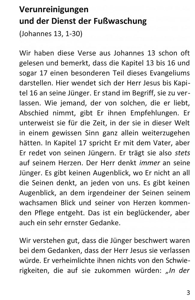 Die Belehrungen aus Johannes 13 sind von grossem Wert. Wir sollen einander die Füsse waschen – d.h. uns durch das Wort Gottes auf Fehler aufmerksam machen, um sie bereinigen zu können. Der Herr Jesus erwähnt in diesem Abschnitt die Glückseligkeit dessen, der die «Fusswaschung» auch tatsächlich praktiziert. Und dazu gibt das Heft Anregung und Hilfe.