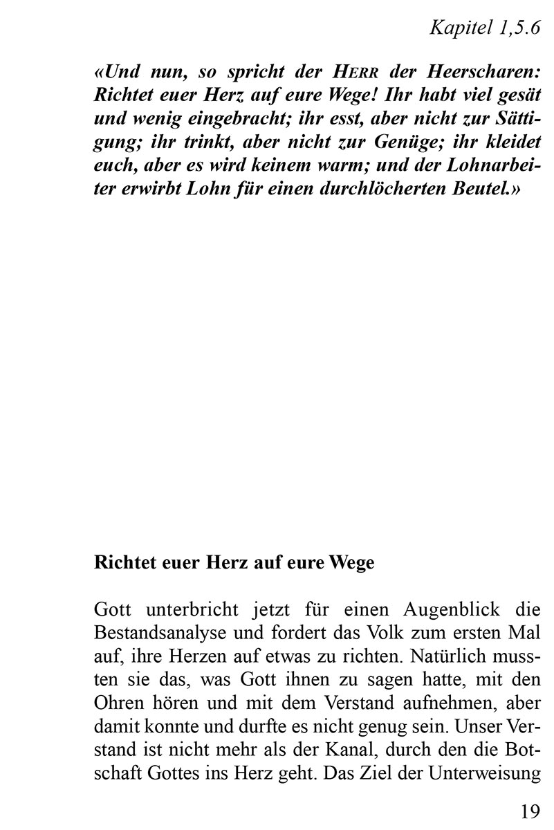 Die Botschaft des Propheten Haggai ist mehr als 2‘500 Jahre alt. Und doch ist sie aktuell und spricht uns direkt an. Sie will uns aufrütteln und uns helfen, eine Standortbestimmung vorzunehmen. Sie macht aber auch Mut. Sie will uns ermuntern, unserem Herrn zu folgen, uns Ihm zur Verfügung zu stellen und mit vollem Einsatz an seinem Haus zu bauen.