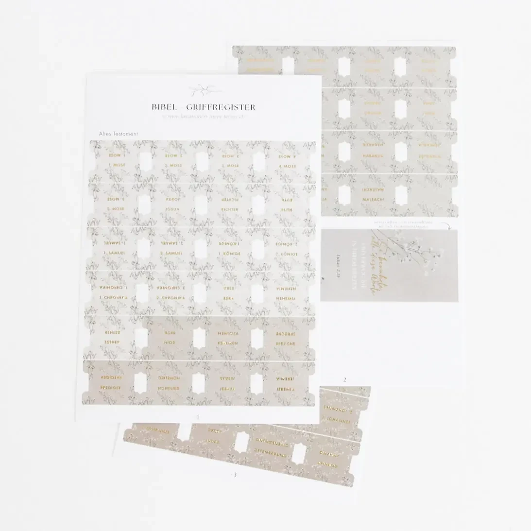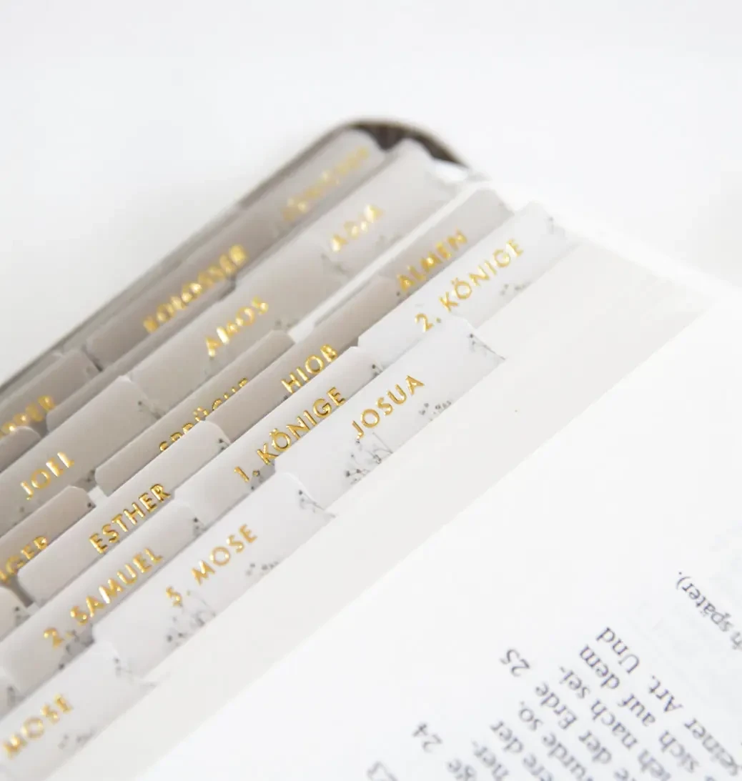 Dieses Register sorgt für mehr Struktur und Übersicht beim Lesen. Die Tabs sind schlicht gestaltet mit feiner Goldprägung und fügen sich harmonisch in die Bibel ein.