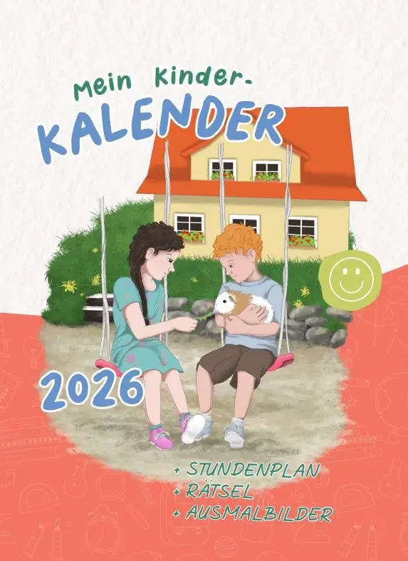 Kinderkalender mit Monatsübersichten, 6 interessanten Geschichten mit Lilly & Noah, 5 Ausmalbildern, zusätzlichen Suchbildern und Rätseln.
